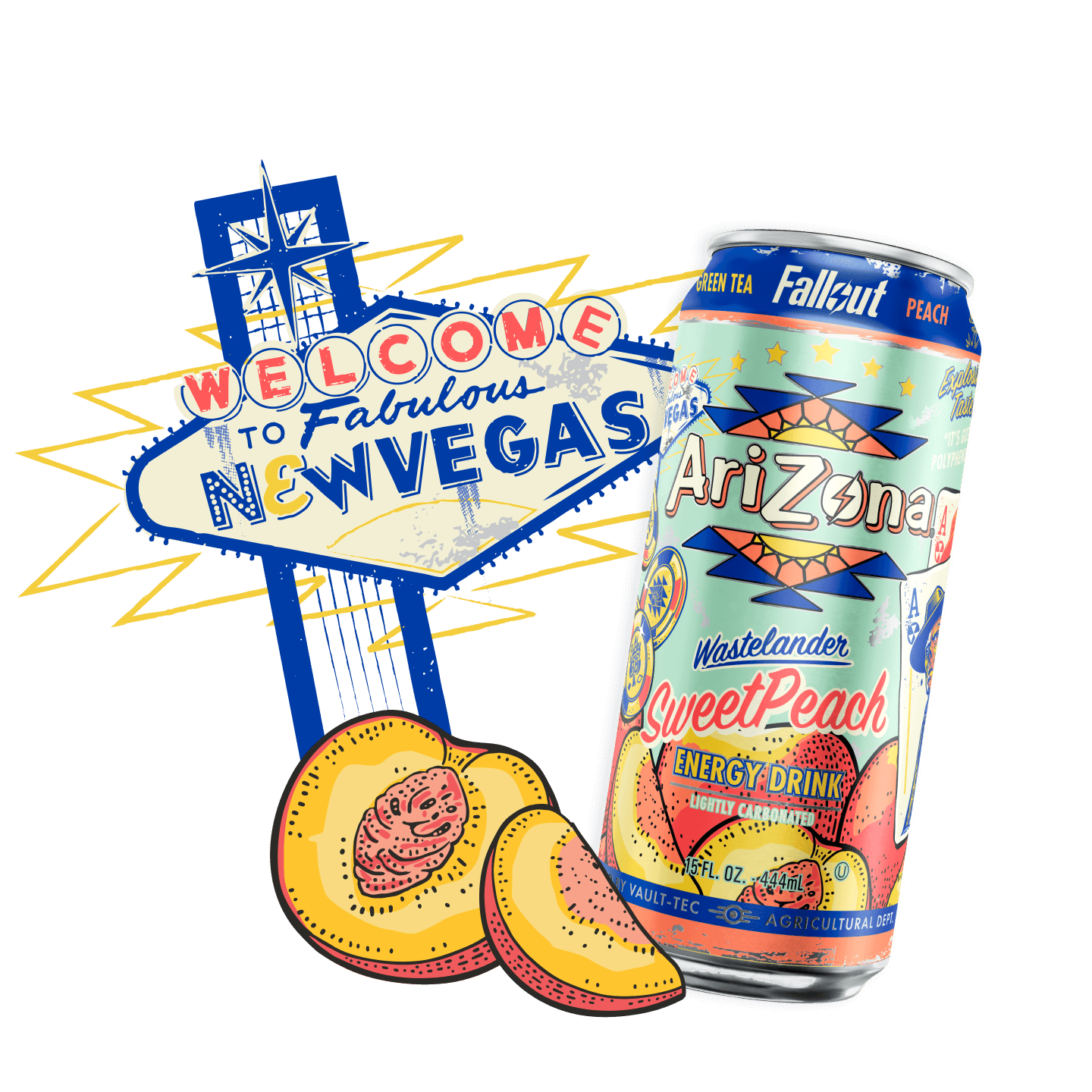 AriZona x Fallout. Delivering a high-voltage energy boost, this pack of Wastelander Sweet Peach Energy Drinks features 190 mg of caffeine and real fruit juice.