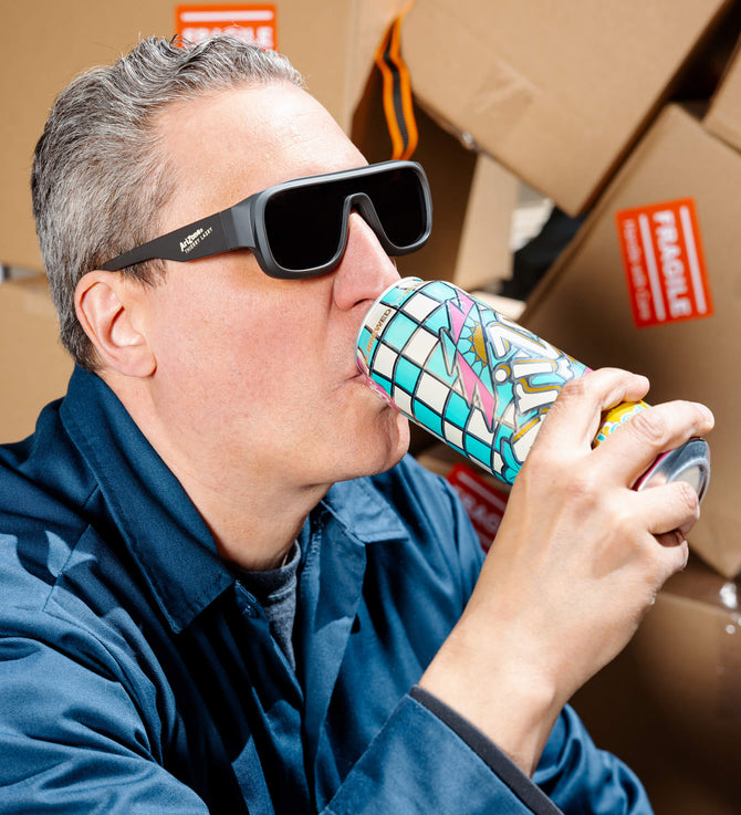 AriZona x Thierry Lasry. Handpainted in Italy, these futuristic frames showcase an industrial shield silhouette, dual-logo design, and gradient lenses.